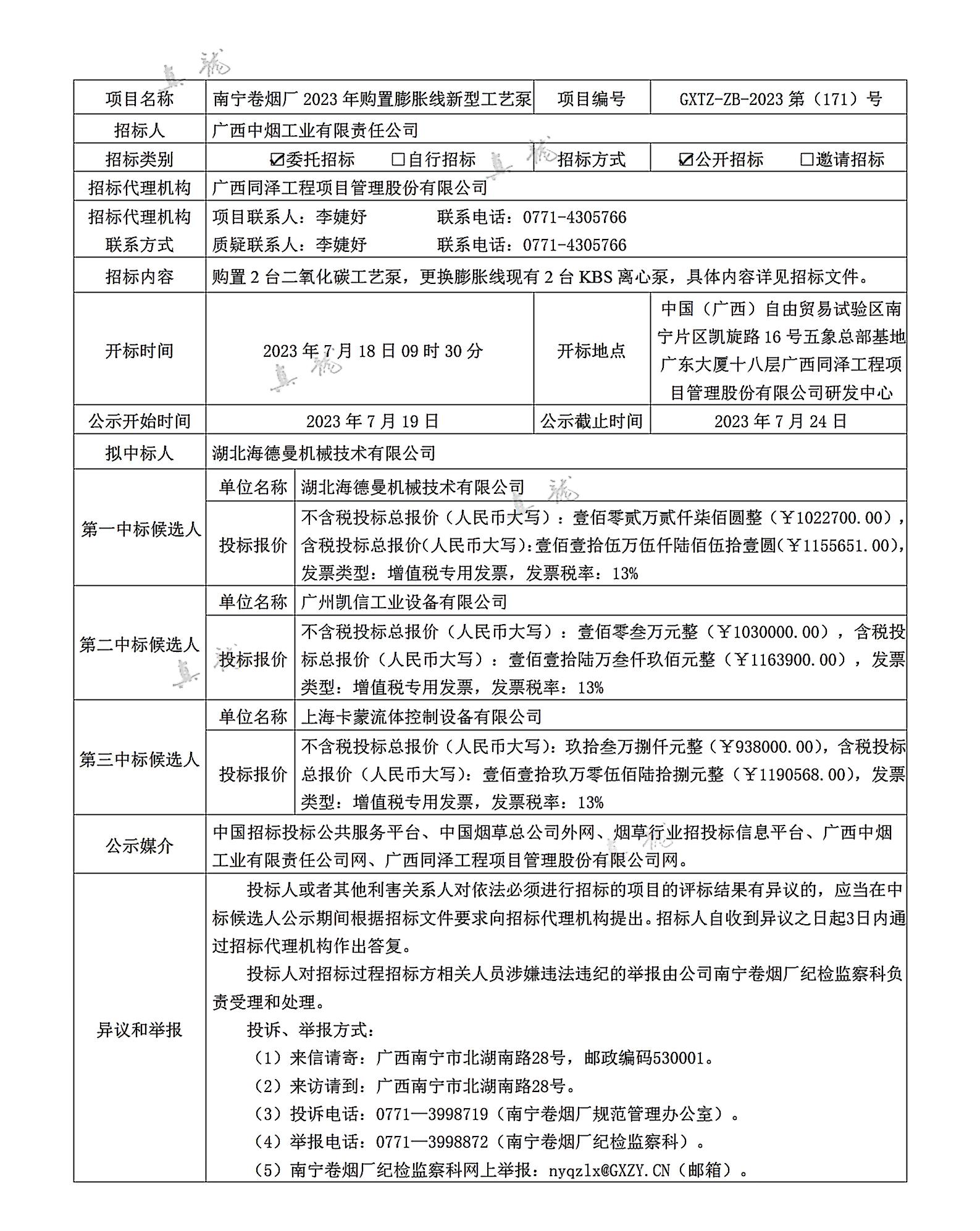 廣西中煙工業(yè)有限責(zé)任公司南寧卷煙廠2023年購置膨脹線新型工藝泵(項(xiàng)目編號:GXTZ-ZB-2023第(171)號)中標(biāo)候選人公示