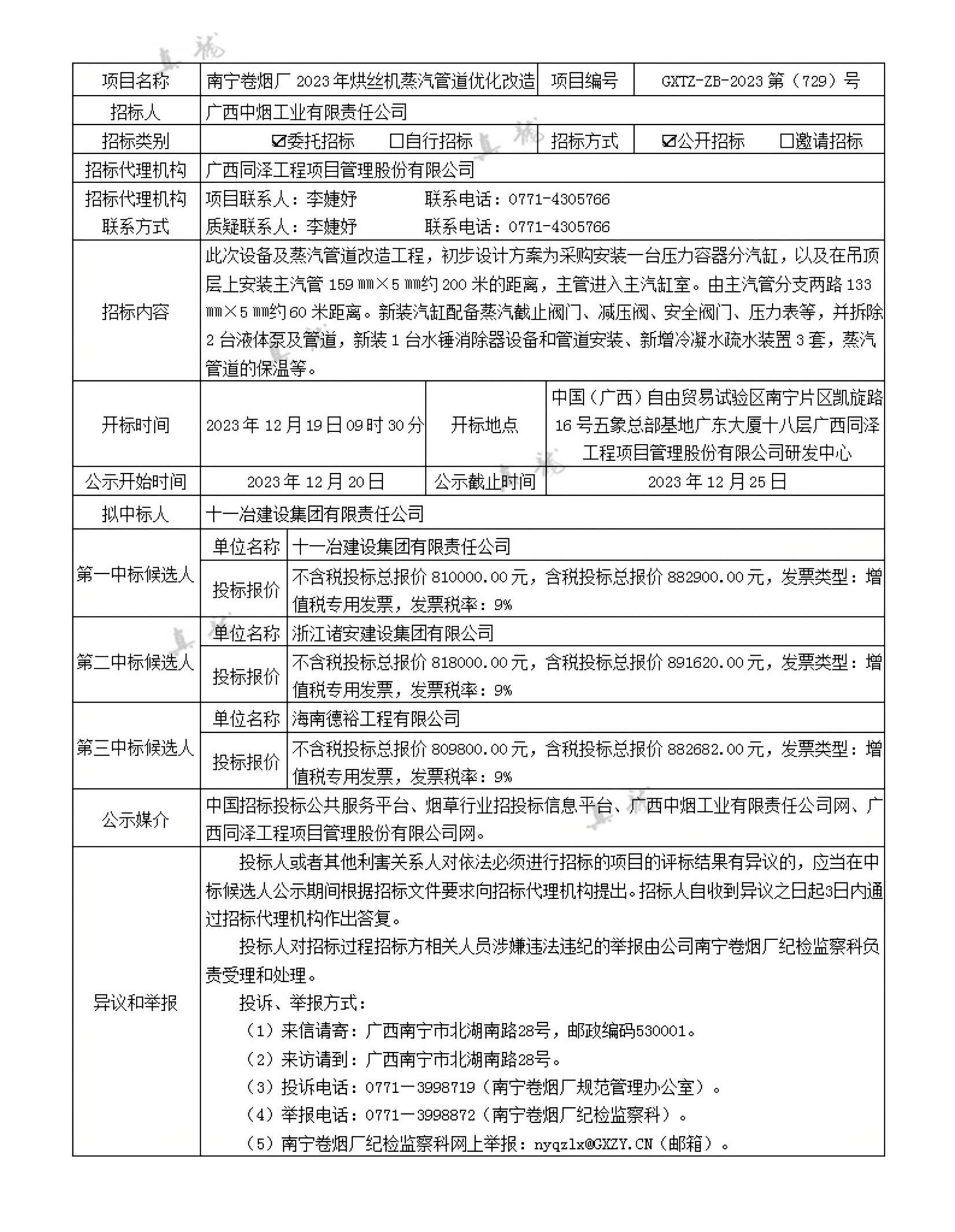 廣西中煙工業(yè)有限責(zé)任公司南寧卷煙廠2023年烘絲機(jī)蒸汽管道優(yōu)化改造(項(xiàng)目編號:GXTZ-ZB-2023第(729)號)中標(biāo)候選人公示