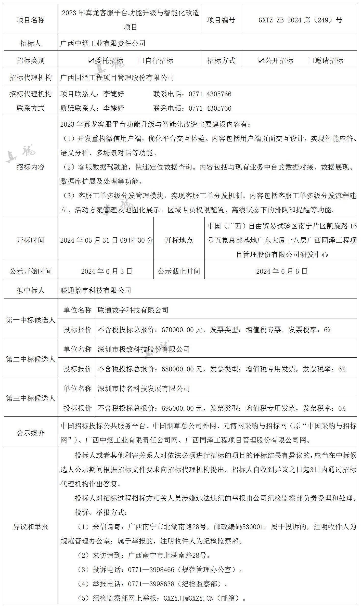 廣西中煙工業(yè)有限責(zé)任公司2023年真龍客服平臺(tái)功能升級(jí)與智能化改造項(xiàng)目(項(xiàng)目編號(hào):GXTZ-ZB-2024第(249)號(hào))中標(biāo)候選人公示