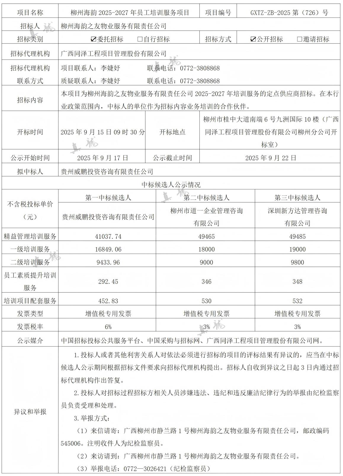 柳州海韻之友物業(yè)服務(wù)有限責(zé)任公司柳州海韻2025-2027年員工培訓(xùn)服務(wù)項(xiàng)目(項(xiàng)目編號(hào):GXTZ-ZB-2025第(726)號(hào))中標(biāo)候選人公示